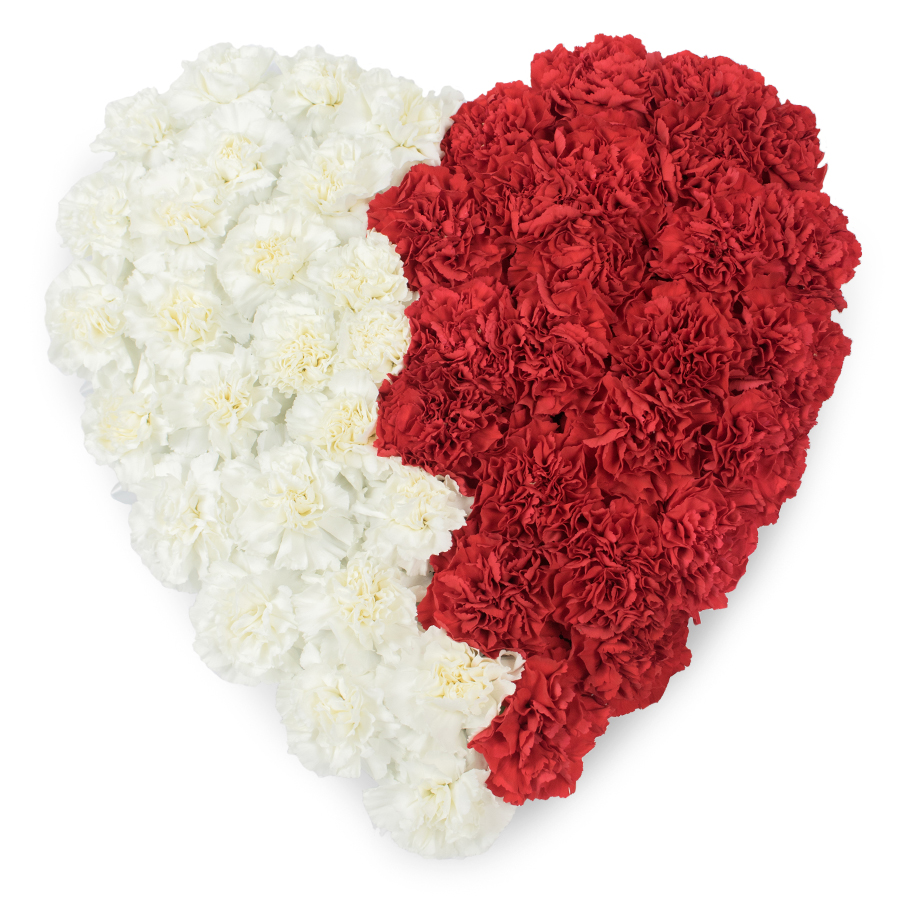 Delight in the stunning beauty of our heart-shaped bouquet, meticulously crafted by Handy Flowers. This unique arrangement showcases a flawless blend of white and red carnations, ideal for conveying heartfelt emotions.